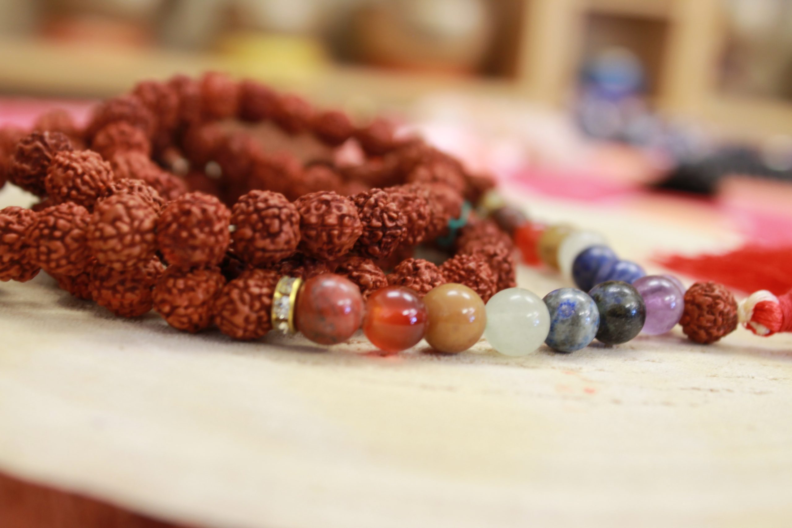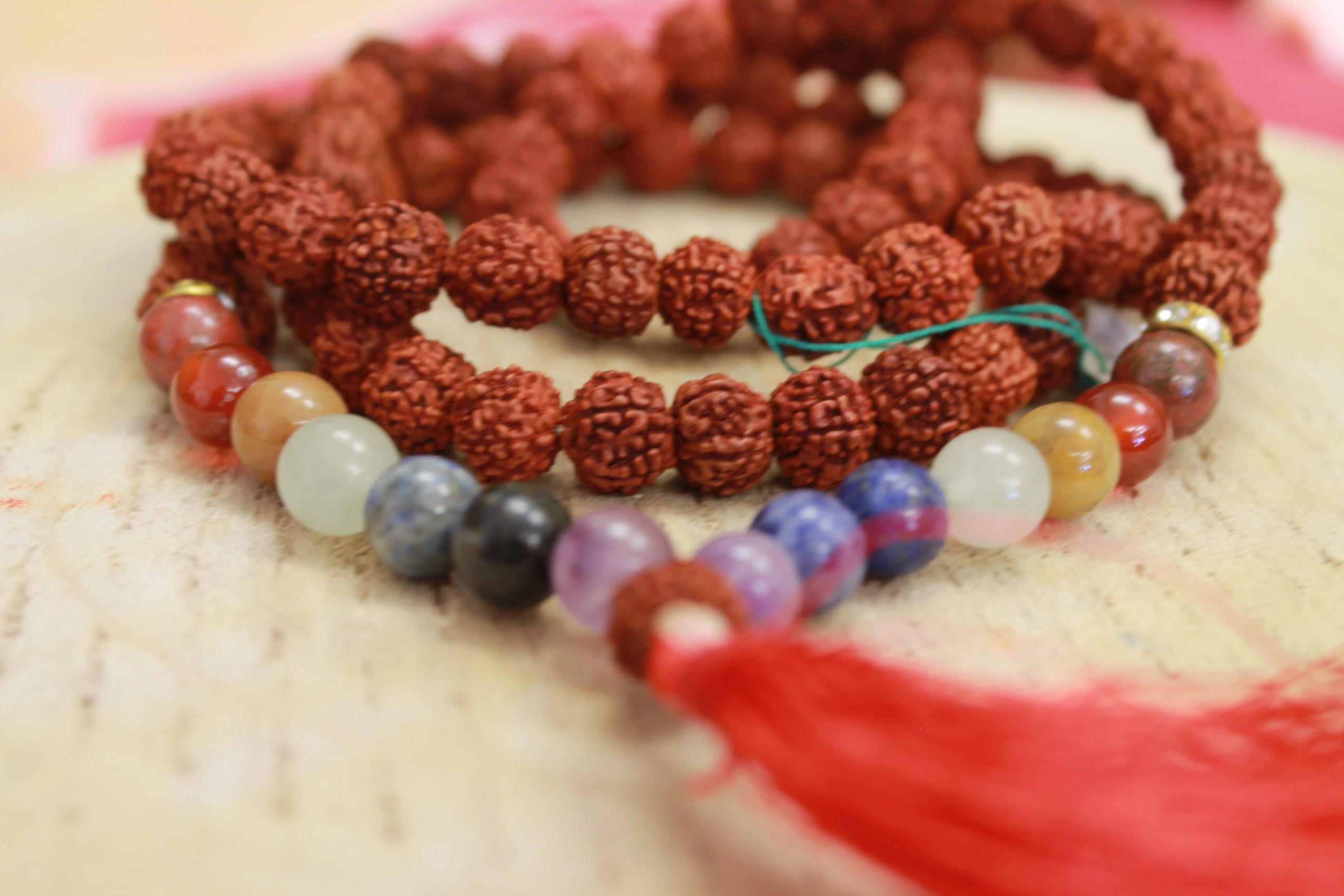 Mala fatto di semi di Rudraksha e pietre dei 7 Chakra: Ametista, Lapislazzuli, Sodalite, Aventurina verde, Diaspro giallo, Corniola, Diaspro rosso.
